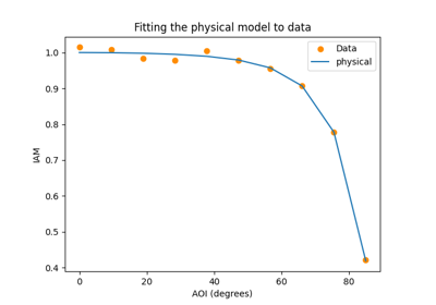 \[IAM = \frac{1 - \exp(-\frac{\cos(aoi)}{a_r})} {1 - \exp(\frac{-1}{a_r})}\]which is presented as \(AL(\alpha) = 1 - IAM\) in equation 4 of [1], with \(\alpha\) representing the angle of incidence AOI. Thus IAM = 1 at AOI = 0°, and IAM = 0 at AOI = 90°. This equation is only valid for 0° <= aoi <= 90°, therefore iam is constrained to 0.0 outside this interval.