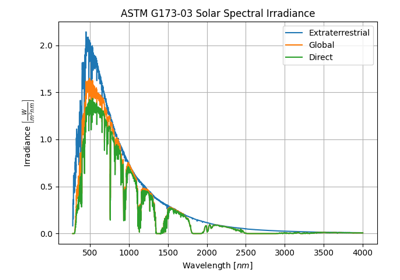 are too widely spaced, the integral of each spectrum may deviate from its standard value. For global spectra, it is about 1000.37 W/m².The values of the ASTM G173-03 provided with pvlib-python are copied from an Excel file distributed by NREL, which is found here [2]: https://www.nrel.gov/grid/solar-resource/assets/data/astmg173.xls